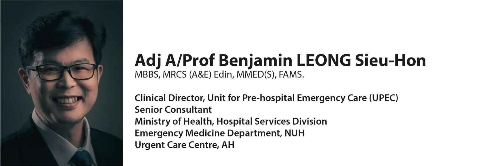 Dr Benjamin Leong is a Senior Consultant at the Department of Emergency Medicine in National University Hospital and at the Urgent Care Centre in Alexandra Hospital. He serves as the Clinical Director of the Unit for Pre-hospital Emergency Care (UPEC).